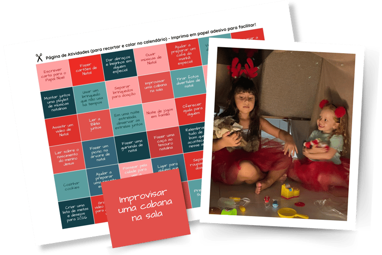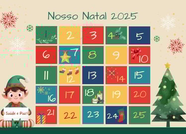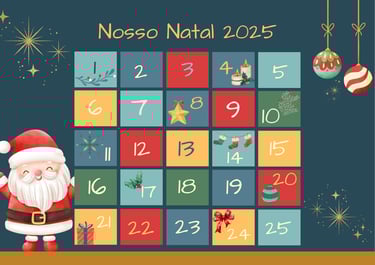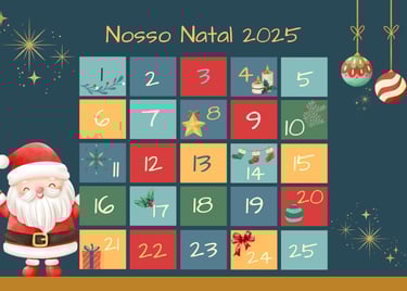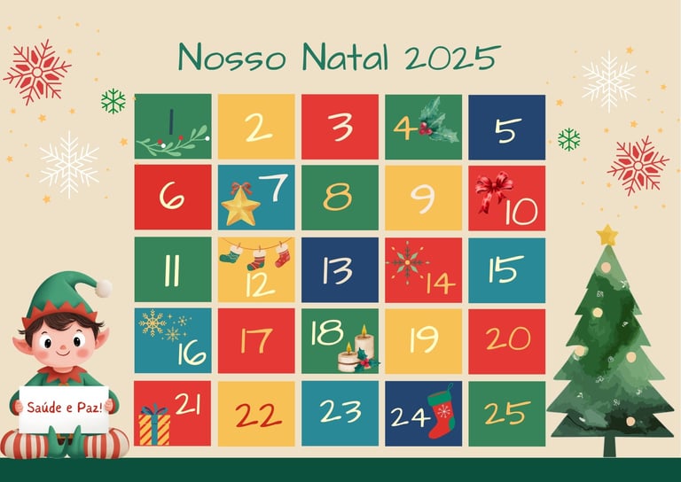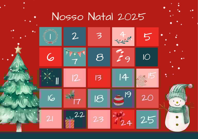 Pensando em flexibilidade e adaptação às rotinas familiares, enviamos 40 sugestões de atividades para que possam escolher as 25 que melhor se encaixam em seu dia a dia. Dessa forma, o calendário se torna personalizado e ainda mais especial. As atividades propostas ajudam a criar o clima de Natal, incentivando o desenvolvimento de valores essenciais, como gratidão, caridade, solidariedade e gentileza. Cada dia traz uma nova oportunidade de conexão, amor e reflexão, aproximando as famílias do verdadeiro significado desta data.