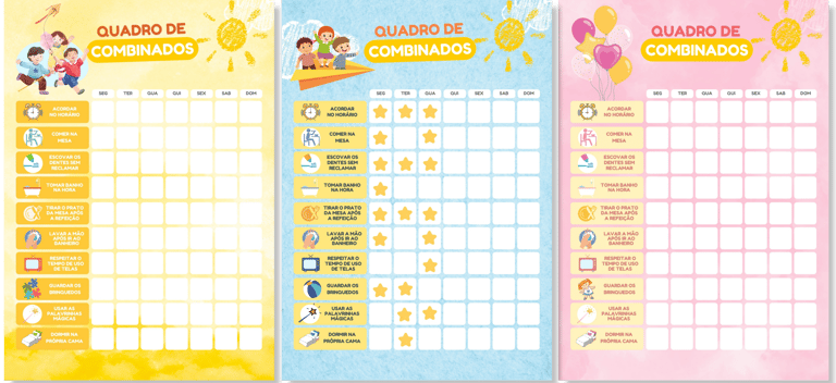 Quadro com 10 rotinas, como acordar no horário, comer sentado à mesa ou guardar os brinquedos. A cada tarefa feita, uma estrelinha! Adquirindo, você receberá as 3 cores (azul, amarelo e rosa), escolha a sua e imprima!